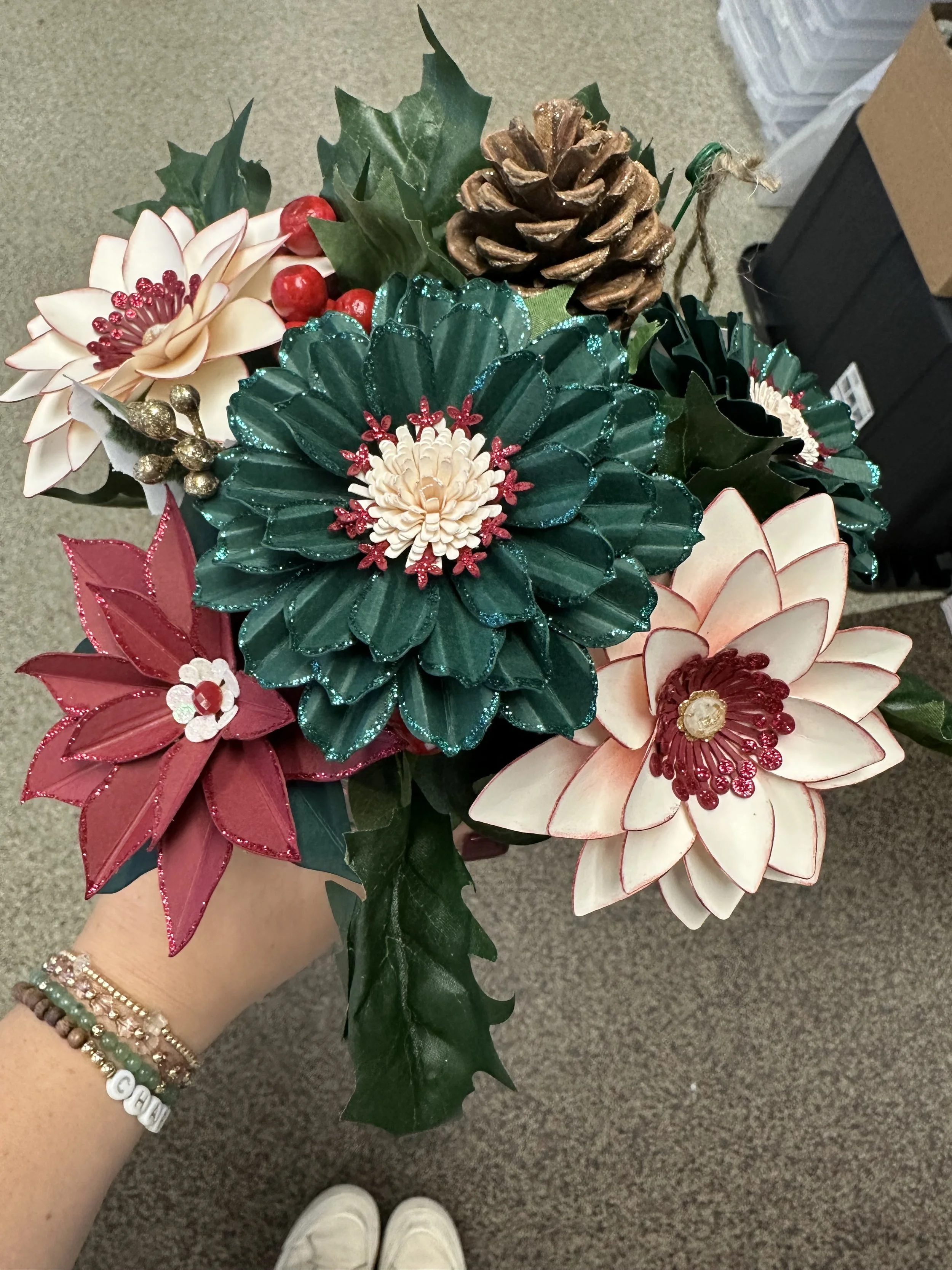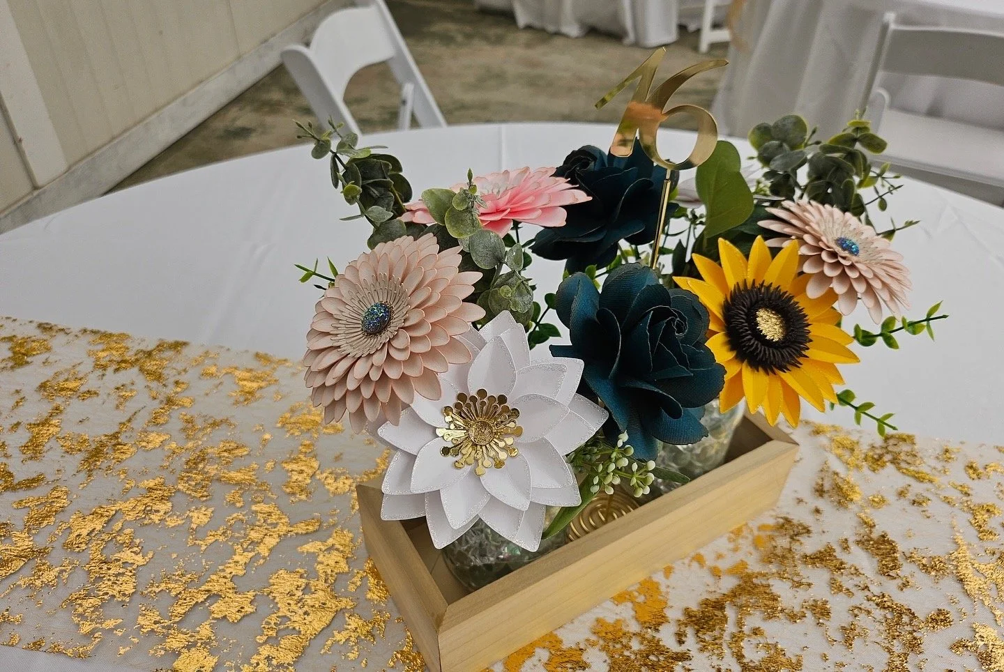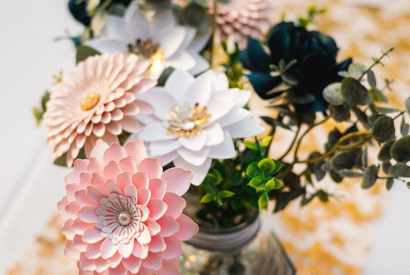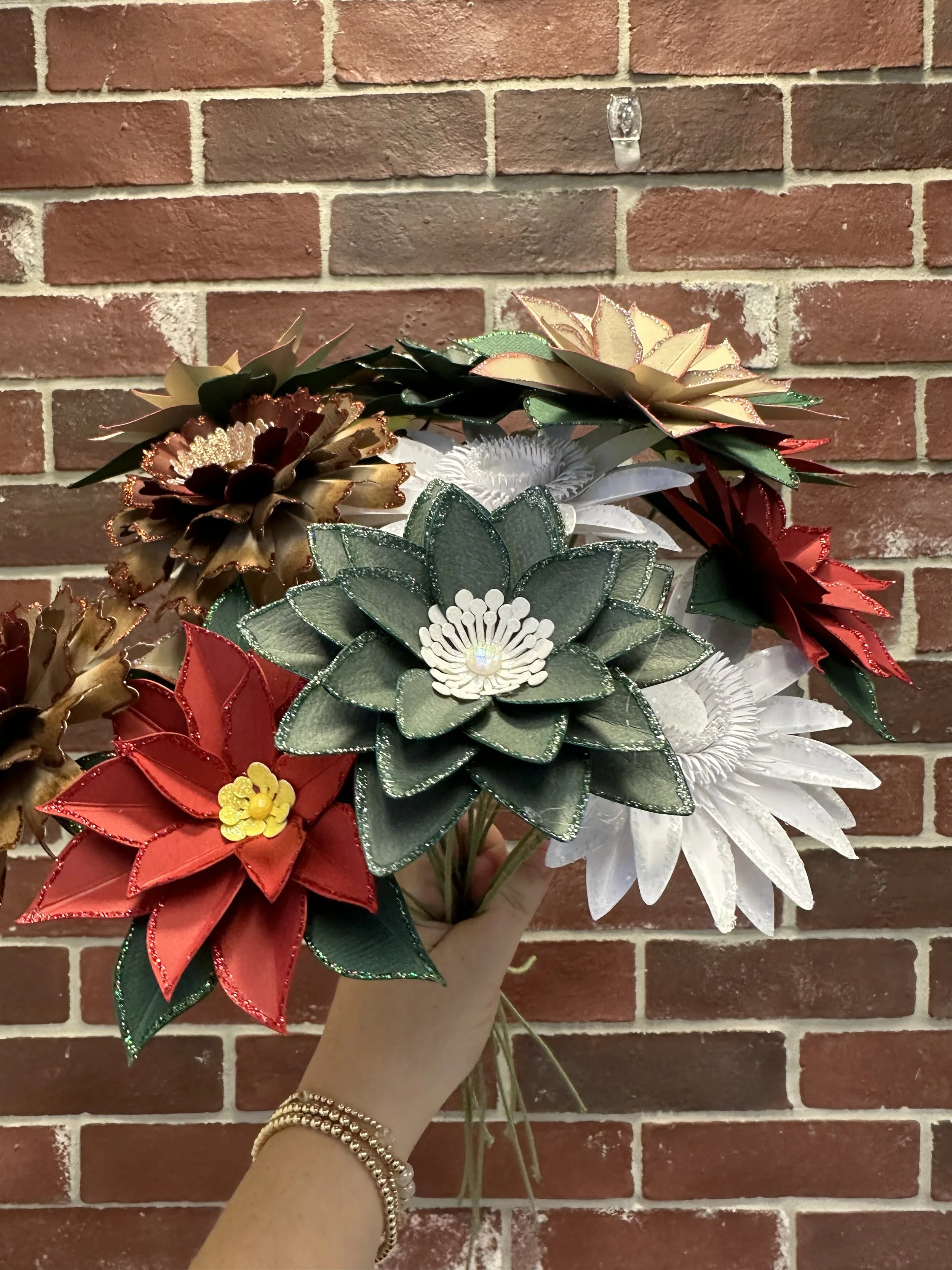 Our paper flowers are handcrafted using high quality card stock, water based inks, stickles and various gems. Our flowers last forever and require no maintenance!